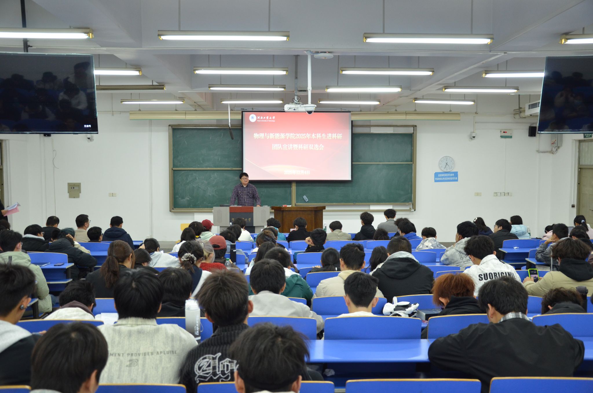 本次活动旨在进一步夯实学院“三全育人”工作基础,加强学生工作与科研和人才培养工作的协同联动,助力学生提升科技创新能力。活动采取“教师宣讲+学生报名”的双选模式,面向本科生招募科研团队成员,参与项目研发、竞赛培育及论文撰写等工作,覆盖光电传感与智能检测技术、计算物理与新材料智能设计、光电效应综合利用等多个研究方向。活动吸引了学院不同年级近200名学生参与,在科研团队与学生之间搭建起良性互动的桥梁。
